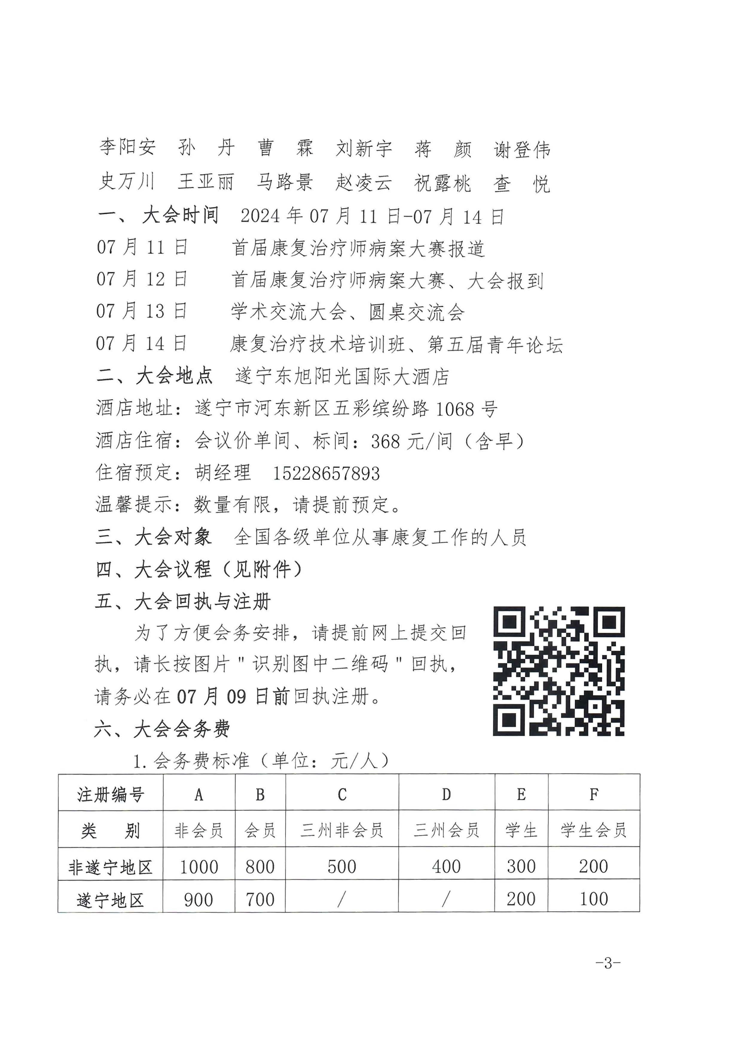 | 川康协发2024-12-2024四川省康复治疗师协会第八次学术大会暨康复治疗技术培训班-主动公开.pdf 各康复相关单位,协会各分支机构,康复同道: 为了推动康复治疗的学术交流和发展,四川省康复治疗师协会第八次学术大会将于2024年07月11日—07月14日在遂宁市召开。本届大会由四川省康复治疗师协会、遂宁市中心医院举办,遂宁市中心医院康复分院、遂宁市康复医学质量控制中心协办。包含学术交流会、康复治疗技术培训班,首届四川省康复治疗师协会康复治疗师病案大赛以及第五届青年论坛。本次学术大会主题为“踏征程、凌万里、扬鸿鹄”。 会议将邀请国内外专家共同探讨物理治疗、作业治疗、假肢矫形、以及其他康复治疗亚专业的发展现状以及未来方向,探讨康复治疗专业团体组织在康复各亚专业学科发展以及国际接轨中的重要角色和作用。会议培训班部分将针对康复治疗领域实际问题,将新理论及观念引入临床实践过程,有针对性地提升专业技能,促进康复治疗的发展。 大会名誉主席:何成奇 何素玉 大 会 主 席 :刘沙鑫 胡可慧 大会执行主席:陈奕杰 程 康 举 办 单 位 :四川省康复治疗师协会 遂宁市中心医院 协 办 单 位 :遂宁市中心医院康复分院 遂宁市康复医学质量控制中心 学 术 委员会: 何成奇 潘 钰 闫彦宁 王于领 李奎成 祁 奇 余 茜 罗 伦 高 强 胡可慧 朱 毅 王雪强 杨 霖 张少军 晏梓宴 王 茁 魏楠楔 徐 磊 王亚丽 赵维维 肖 冰 向 超 执 行 委员会: 陈奕杰 程 康 杨永红 虞记华 苏文渊 高 强 涂 美 杨 霞 苏 俊 蒋佼佼 吴志刚 谢媛媛 张 晗 陈政铭 杨 霖 曾 真 付选明 易文远 李小华 贾程森 喻鹏铭 张少军 黄 林 石 薇 毕文光 晏梓宴 龙忽林 刘 静 赖华兵 韩林林 吴 强 王永正 秦 涛 王孝云 赵维维 张 逸 李阳安 孙 丹 曹 霖 刘新宇 蒋 颜 谢登伟 史万川 王亚丽 马路景 赵凌云 祝露桃 查 悦 一、 大会时间 2024年07月11日-07月14日 07月11日