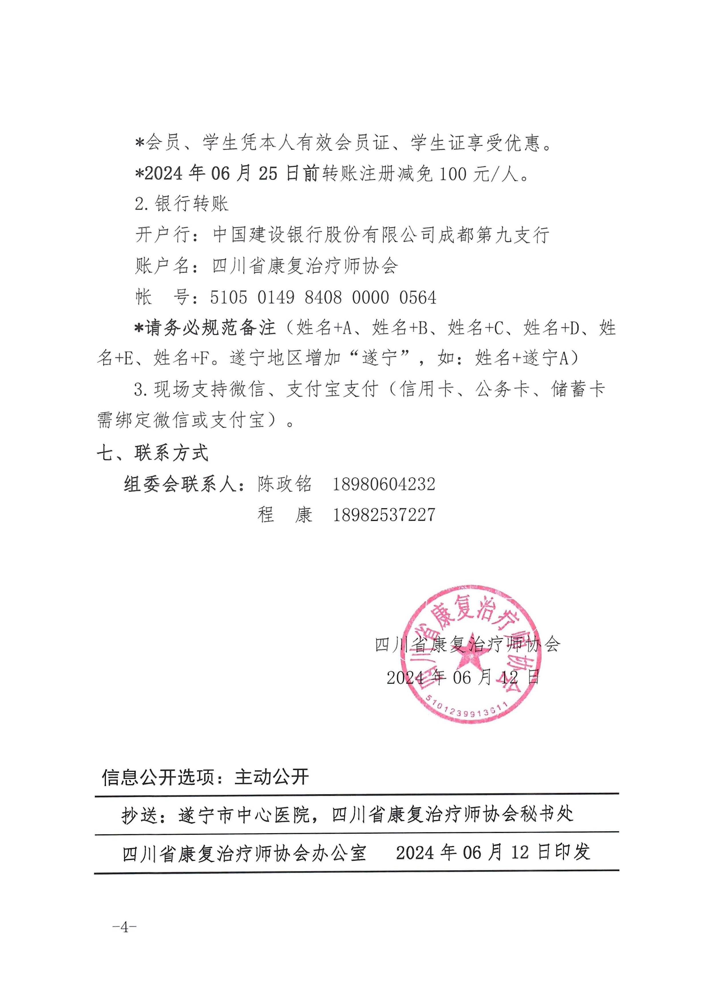 号:5105 0149 8408 0000 0564 *请务必规范备注(姓名+A、姓名+B、姓名+C、姓名+D、姓名+E、姓名+F。遂宁地区增加“遂宁”,如:姓名+遂宁A) 3.现场支持微信、支付宝支付(信用卡、公务卡、储蓄卡需绑定微信或支付宝)。 七、联系方式 组委会联系人: 陈政铭 18980604232 程 康 18982537227 四川省康复治疗师协会 2024年06月12日 扫一扫在手机端打开当前页 |